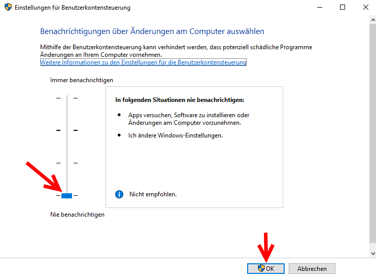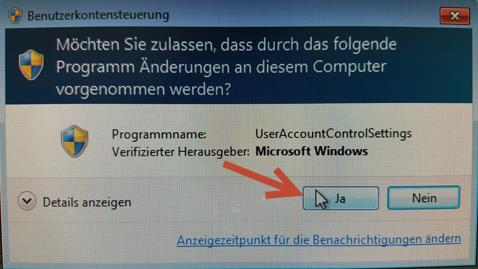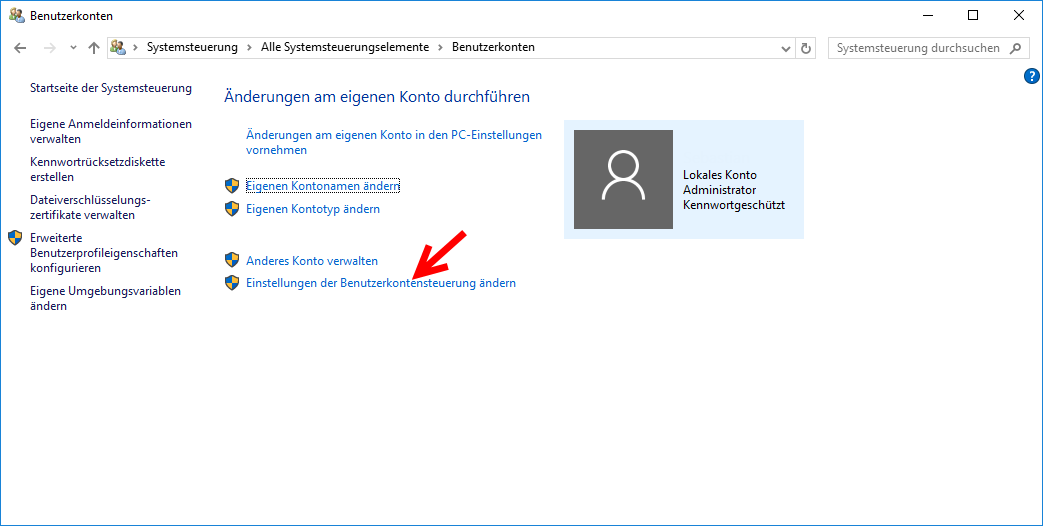 Das Deaktivieren der Benutzerkontensteuerung ist nur im Administrator Konto des