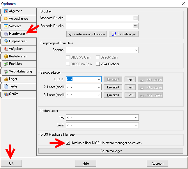 Aktivieren Sie den dios Hardware Manager und bestätigen Sie anschließend mit OK.