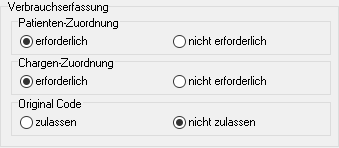 Ist für das Produkt eine Patienten-Zuordnung erforderlich, z.B. immer dann, wenn das Produkt im und am Patienten verbleibt, wird diese als erforderlich eingestellt. Wird die Chargen-Zuordnung erforderlich gespeichert, muss die Bestandsberechnung auf Summe Lieferungen eingestellt sein. Eine Chargen-Zuordnung des Produktes ist immer dann hilfreich, wenn nach einer Behandlung z.B. Unregelmäßigkeiten auftreten, um z.B. weitere Patienten heraussuchen zu können, die sich ebenfalls einer Behandlung mit der betreffenden Charge dieses Produktes unterzogen haben. Ist der Original Code des Produktes eindeutig und es existiert auch keine weitere Lieferung mit identischer Produktcharge kann der Punkt Original Code zulassen aktiviert werden, dann entfällt der Etikettenausdruck je Produktlieferung.