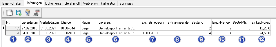 Löschen: Die Lieferung mit der Dreieck-Markierung wird gelöscht, wenn noch keine Verbräuche zu dieser Lieferung erfasst wurden