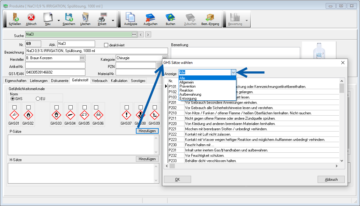 Über die Buttons Hinzufügen können P- bzw. H-Sätze hinzugefügt werden. H-Sätze (Hazard Statement) beschreiben Gefährdungen, die von chemischen Stoffen oder Zubehör ausgehen können. P-Sätze (Precautionary Statement) geben Sicherheitshinweise zum Umgang mit dem Produkt.