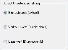 Die Filteroption Ansicht Kostendarstellung ermöglicht die Kostendarstellung für aktuelle Einkaufspreise, durchschnittliche Verkaufswerte und durchschnittliche Lagerwerte.