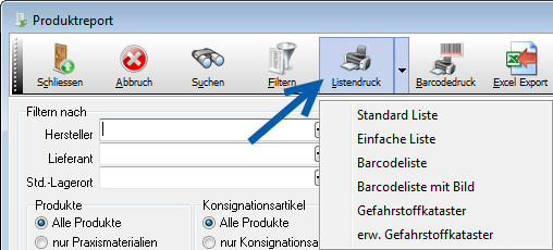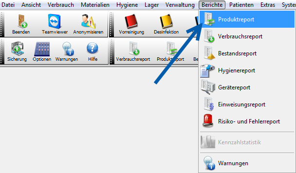 Der Produktreport wird über den Menüpunkt Berichte, Auswahlpunkt Produktreport oder...