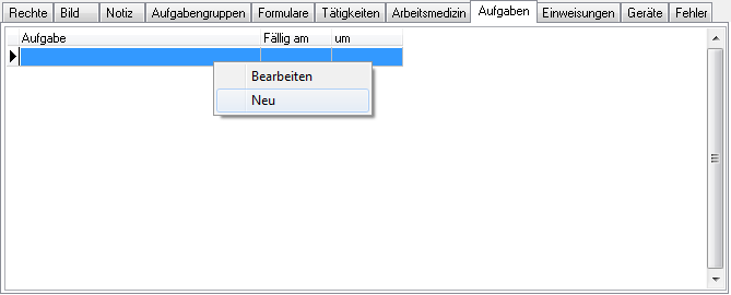 Bereits gespeicherte Aufgaben werden über das rechte Maustastenmenü, Auswahlpunkt Bearbeiten geändert. Über den Auswahlpunkt Neu wird die Aufgabenverwaltung geöffnet. Lesen Sie Näheres in der Beschreibung zur ...