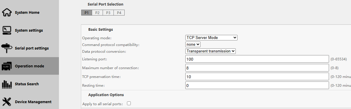 Hier müssen Sie den Wert bei dem Punkt ?Operating mode? auf ?TCP Server Mode? umstellen. Ändern Sie dies für alle Ports des COM-Servers.