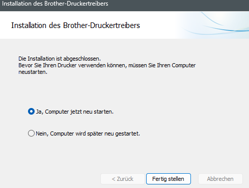Um die Installation des Drucker-Treibers erfolgreich abzuschließen, starten Sie Ihren Rechner nun neu.