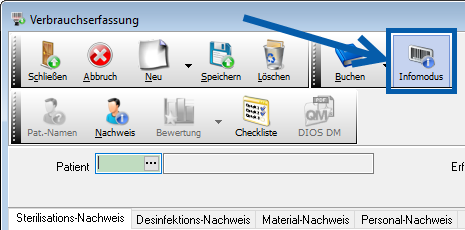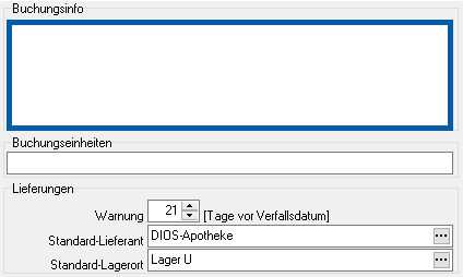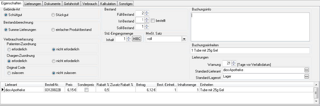 Die Gebinde-Art des Produktes wird in Schüttgut und Stückgut unterschieden. Schüttgüter sind alle Produkte, die an mehreren Patienten in variierenden Mengen verabreicht werden können. Ein Schüttgut reduziert sich immer dann, wenn der Button Ausbuchen aktiviert (blau markiert) ist. Stückgüter werden mit jedem Verbrauchs-Barcodescann in der Menge um je 1 Stück verringert, sobald eine Lieferung die Menge 0 erreicht hat, wird eine Warnung im Programm ausgegeben.