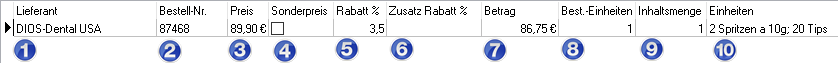 In der Spalte Lieferanten (1) werden untereinander alle Lieferanten dargestellt, die zu dem aufgerufenem Produkt gespeichert wurden. Die nächsten Spalten geben die Bestell-Nr. (2) und den Preis (3) je Lieferant aus. Der Wert der Tabellenzelle Rabatt (5) stammt aus der Lieferantenverwaltung. Bietet der Lieferant aktuell einen zusätzlichen Rabatt (6) an, wird dieser in der nächsten Zelle eingetragen. Daraus wird der folgende Betrag (7) ermittelt. Im Folgenden muss entschieden werden, ob immer die gleiche Bestelleinheit (8) geordert werden soll. Weiterhin wird die Inhaltsmenge (9) gespeichert. Die Zelle Einheiten (10) erlaubt eine weitere Erklärung der Mengenangabe, was im Praxisbetrieb sehr hilfreich ist. Um mit dem Füll-Bestand zu arbeiten, ist hier ein Eintrag der Inhaltsmenge und Einheiten notwendig.