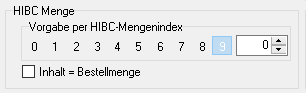 Hier ist direkt die aus dem Barcode stammende Zahl als Platzhalter für den Mengenindex farblich hinterlegt. Handelt es sich bei diesem HIBC-Produkt immer um die gleiche Menge, wird der Mengenwert in das Zahlenfeld eingegeben. Das darunter liegende Kästchen Inhalt = Bestellmenge wird immer dann aktiviert, wenn die Inhaltsmenge direkt in die Eingangsmenge der neuen Lieferung übernommen werden soll.