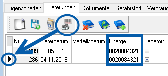 Wird in der Praxis eine Produktlieferung mit der gleichen Charge einer bereits bestehenden Produktlieferung angeliefert, müssen für beide Lieferungen mit der identischen Produktcharge eindeutige Etiketten aus dem Programm gedruckt werden. Achten Sie in diesem Fall besonders auf das schwarze Dreieck in der Lieferungen-Tabelle im Register Lieferungen.