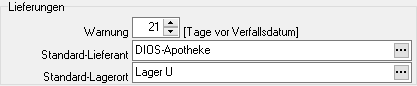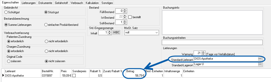 Soll ein Betrag für das aufgerufene Produkt ausgegeben werden, muss ein Standard-Lieferant sowie der Standard-Lagerort ausgewählt werden. Der Betrag des Produktes wird mithilfe der Lieferanten-Konditionen ermittelt. Diese Angaben müssen zuvor in der Raum- bzw. Lieferanten-Verwaltung gespeichert sein.