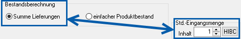 Das Feld Std.-Eingangsmenge wird in Verbindung mit der Bestandsberechnung-Einstellung Summe Lieferungen genutzt. Liegt ein Produkt mit einem HIBC-Barcode vor, wird der Button HIBC einmalig angeklickt. Direkt wird das Feld HIBC Menge sichtbar.