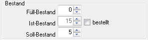 Im Abschnitt Bestand wird der Füll-, der Ist- und der Soll-Bestand zu dem aufgerufenen Produkt ausgegeben. Der Füll-Bestand ist ein Vorgabewert für neue Bestellungen. Auf diese Menge soll das Produkt wieder aufgefüllt werden. Der Ist-Bestand ist die tatsächliche Mengenangabe zu dem Produkt. Der Soll-Bestand bezeichnet die Mindestmenge zu diesem Produkt, bei Unterschreitung der gespeicherten Menge wird eine Warnung vom Programm ausgegeben.