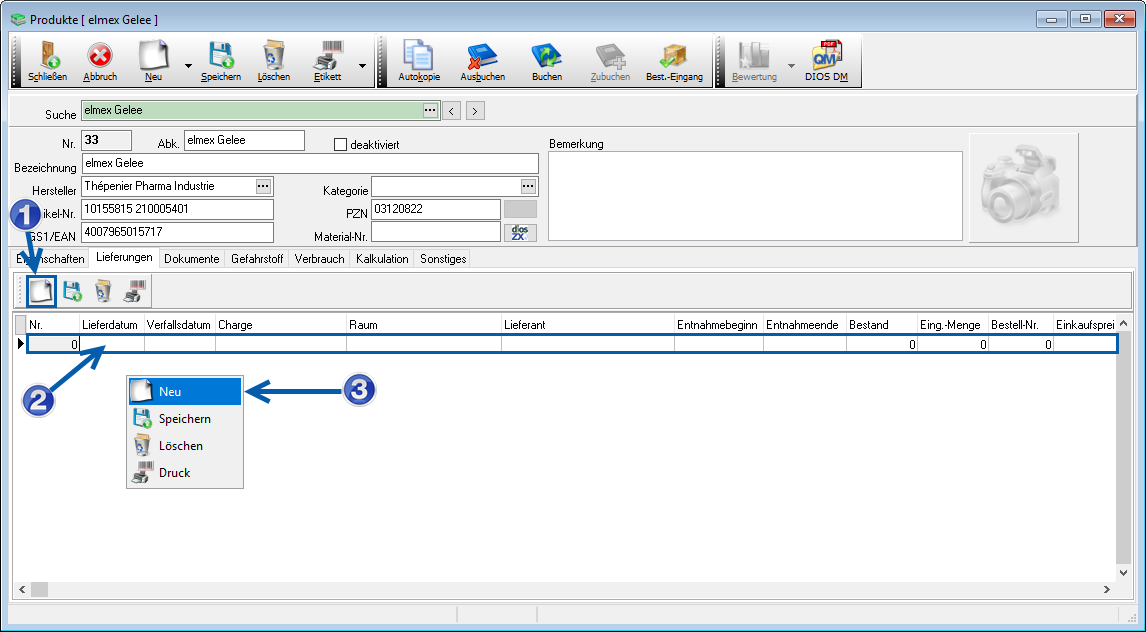 Je nach dem Informationsgehalt des Produktbarcodes werden in der Lieferzeile bereits einige Zellen mit den Angaben aus dem Barcode gefüllt. Füllen Sie fehlende Angaben aus und speichern abschließend.