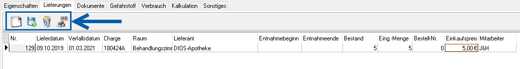 Speichern Sie alle Angaben zur Lieferung. Der Bestand dieser Lieferung wird sich durch dokumentierte Verbräuche reduzieren. Bei Unterschreitung des Soll-Bestandes und/oder bei Überschreitung des Verfallsdatum wird eine Warnung vom Programm ausgegeben.