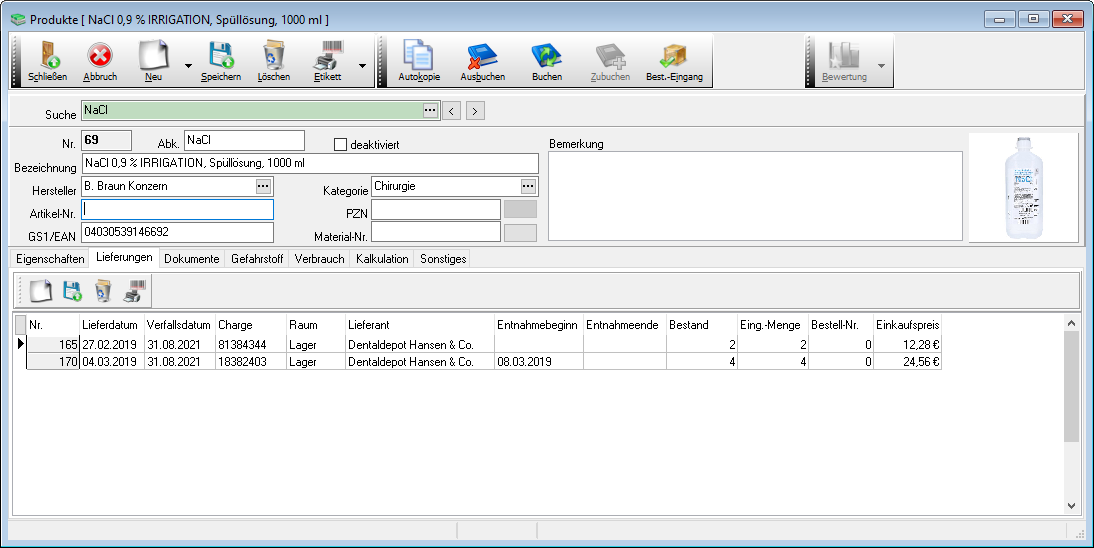Im Register Lieferungen werden alle bisher gespeicherten Lieferungen zu dem aufgerufenen Produkt tabellarisch ausgegeben.
