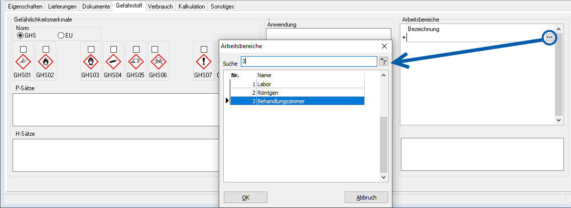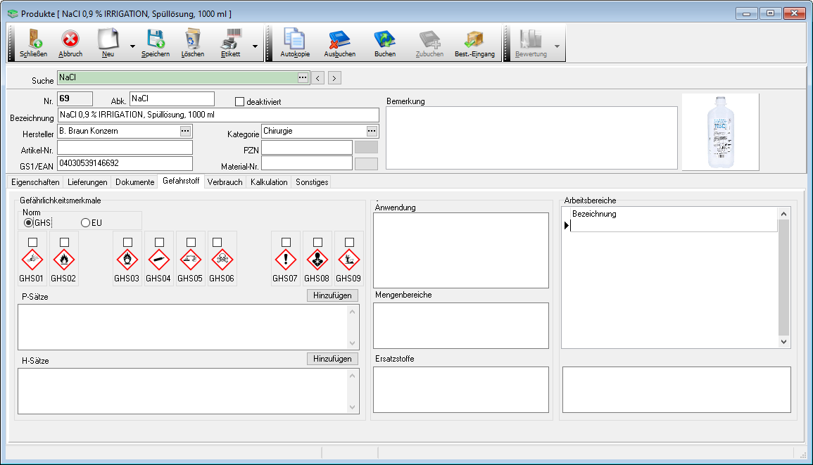 Im Register Gefahrstoff ist eine Kennzeichnung des Produktes bzgl. seiner Gefährlichkeitsmerkmale möglich. Hier sind nähere Angaben zur Anwendung, zum Mengenbereich, den Ersatzstoffen und Arbeitsbereichen möglich.