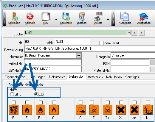 Bitte wählen Sie die korrekte Norm aus, die Gefährlichkeitssymbole werden direkt angepasst.