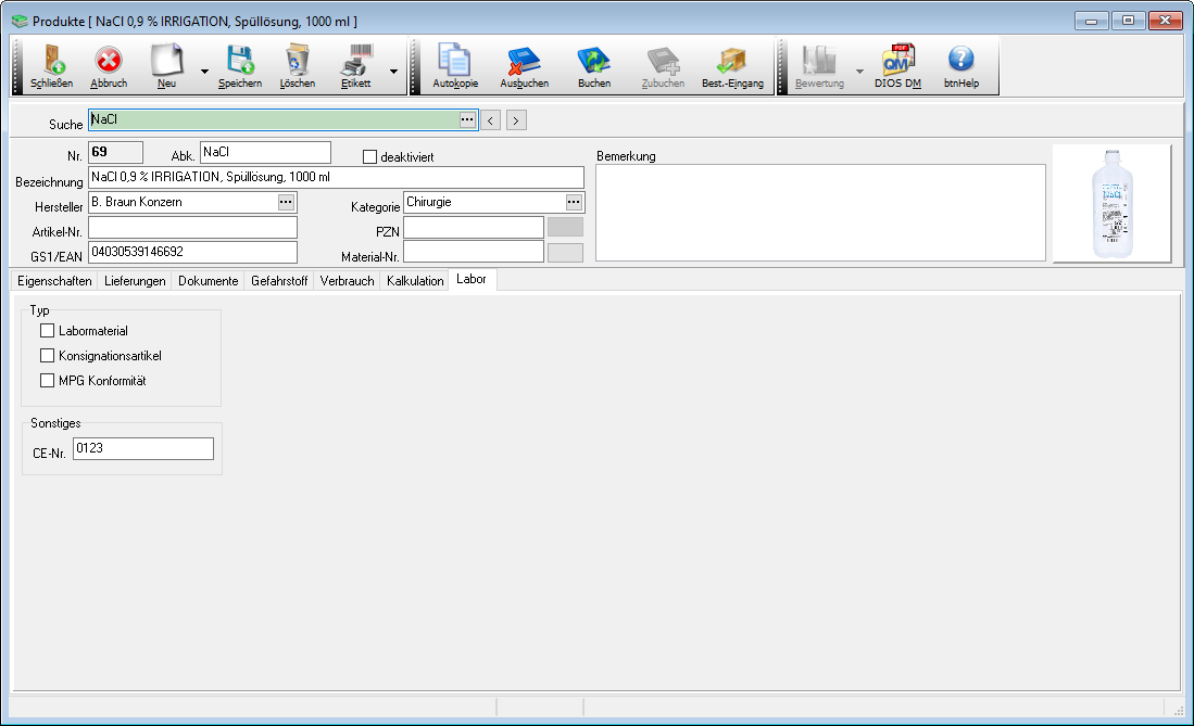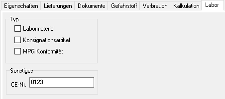 Im Register Sonstiges werden verschiedene Vorgaben zu dem Produkt eingestellt. In dem Feld Typ wird das Produkt als Labormaterial, Konsignationsartikel und/oder MPG Konformität gekennzeichnet.