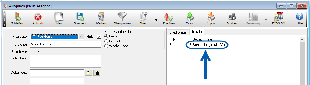 Im Unterregister Geräte zu soeben angelegter Aufgabe findet sich das Gerät Behandlungsstuhl, das in der  Geräteverwaltung aufgerufen ist.