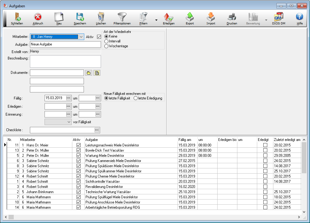 Nach einem Mausklick auf Neu öffnet sich die Aufgabenverwaltung mit einer neuen Aufgabe. Geben Sie hier alle erforderlichen Daten ein und speichern abschließend.