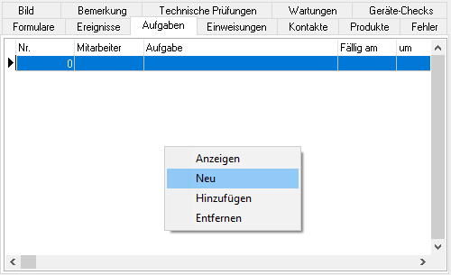 Das Unterregister Aufgaben listet alle Aufgaben je Gerät. Eine neue Aufgabe zu dem ausgewählten Gerät wird über das rechte Maustastenmenü, Auswahlpunkt Neu in der Aufgabenverwaltung angelegt. Bereits gespeicherte Aufgaben zu dem Gerät können ebenfalls über das rechte Maustastenmenü angezeigt werden. Darüber hinaus kann eine bereits gespeicherte Aufgabe aus der Aufgabenverwaltung hinzugefügt werden.
