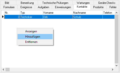 Im Unterregister Kontakte werden die Personen gespeichert, die für das ausgewählte Gerät zuständig sind. Über das rechte Maustastenmenü werden neue Personen hinzugefügt, bestehende Kontakte bearbeitet oder gelöscht.