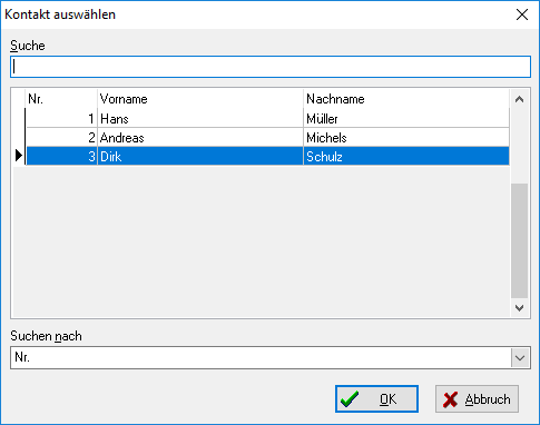 Nach einem Mausklick auf Hinzufügen öffnet sich das Fenster Kontakt auswählen. Hier stehen alle Personen zur Verfügung, die zuvor in die Kontakte (über den Menüpunkt Verwaltung, Auswahlpunkt Kontakte zu erreichen) gespeichert worden sind. Markieren Sie die erforderliche Person und bestätigen mit Mausklick auf OK.
