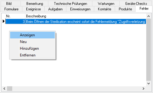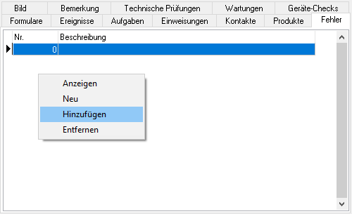 Wurde ein Fehler in Verbindung mit einem Gerät festgestellt, wird dieser im Unterregister Fehler gespeichert. Wählen Sie um, einen bereits gespeicherten Fehler mit dem Gerät zu verknüpfen, den Auswahlpunkt Hinzufügen aus dem rechten Maustastenmenü.