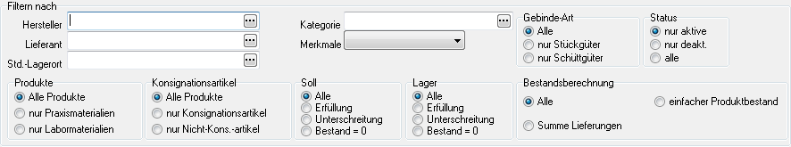 Das Fenster Produktreport listet alle bisher gespeicherten Produkte auf und stellt div. Filteroptionen zur Verfügung. Alle Produkte können z.B. nach Hersteller, Lieferant und/oder Kategorie gefiltert werden. Komfortabel ist die Möglichkeit nach Soll zu filtern. Auf diese Weise kann man einen schnellen Überblick darüber erlangen, welche Produkte wieder nachbestellt werden müssen.