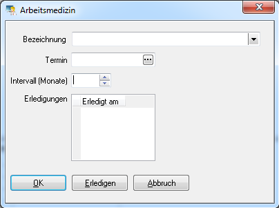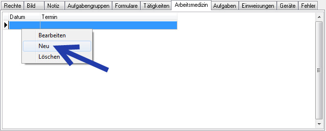 Ein neuer arbeitsmedizinischer Eintrag wird ebenfalls über das rechte Maustastenmenü, Auswahlpunkt Neu, erstellt. Nach dem Mausklick auf Neu erscheint das Fenster Arbeitsmedizin.