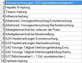 Per Drop-Down-Pfeil im Feld Bezeichnung wird die arbeitsmedizinische Untersuchung ausgewählt. Untenstehende Auswahl steht Ihnen zur Verfügung. Im Abschnitt Arbeitsmedizin-Typen erfahren Sie, wie diese Auswahl verändert bzw. erweitert werden kann.