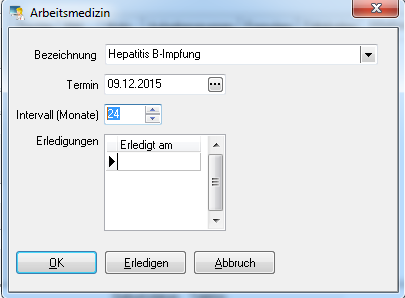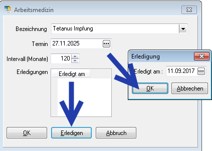 Sobald die Auffrischung durchgeführt wurde, klicken Sie auf den Button Erledigen. Im Fenster Erledigung wird das Datum der Auffrischung/Impfung eingegeben und mit OK bestätigt. So erhalten Sie eine fortlaufende Dokumentation aller arbeitsmedizinischen Untersuchungen.