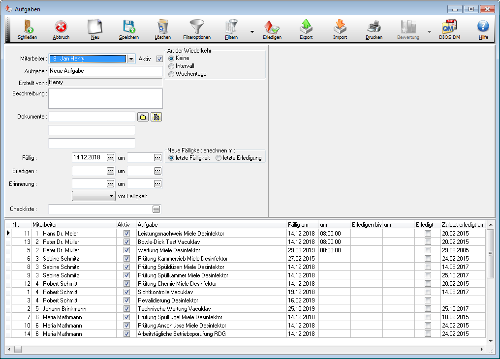 Hier sieht man alle Aufgaben, die einem Mitarbeiter zugeordnet sind. Jedem Gespeicherten Mitarbeiter können Aufgaben zugeordnet werden.