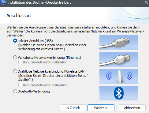 Nachfolgend müssen Sie die Anschlussart Ihres Druckers auswählen.
